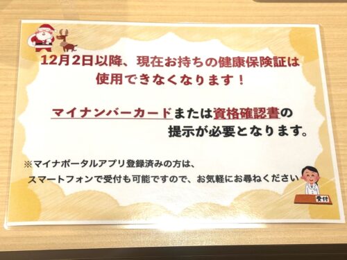 お手持ちの保険証は12/2から使用できなくなりますので、マイナンバーカードか資格確認書の持参をお願いします!
